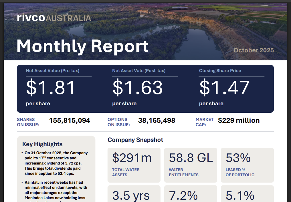 Rivco Australia owns and manages one of the Murray–Darling Basin’s largest and most diverse portfolios of water entitlements.